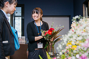 誕生日のギフトや花嫁のブーケ、挙式・披露宴会場のテーブルやロビーに飾る花のアレンジ、ホテルやレストランのスタンドフラワーやテーブルフラワー、イベント会場の飾りつけ、開店祝いなど、さまざまなシーンを花で飾るフラワー装飾の仕事。お客様が満足していただけるよう、好みや目的、予算などを把握して、会場の雰囲気や用途、テーマなどをくみ取り、ふさわしいアレンジや飾り付けを考えます。知識や技術をもとに、自由な発想やセンスが生かせる仕事です。